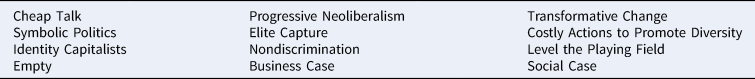 Progressive neoliberalism, elite capture, and nondiscrimination contain elements of symbolic politics,Footnote 12 but their overall emphasis is somewhat different: When confronted with social pressure and critiques from activists, elites and progressive neoliberals focus on words and action to advance diversity, while steering developments in a market-conforming direction. In this vein, radical authors disparagingly refer to “neoliberal democrats and the capitalist blocs they serve.”Footnote 13 Following Fraser, we can distinguish between Donald Trump's reactionary populism, progressive neoliberalism, and progressive populism. In Fraser's words, “The progressive neoliberal program for a just status order did not aim to abolish social hierarchy but to ‘diversify’ it, ‘empowering’ ‘talented’ women, people of color, and sexual minorities to rise to the ‘top.’”Footnote 14 In the elite capture view,Footnote 15 elites co-opt identity politics to pursue corporate DEI goals, which allows them to emasculate movements such as BLM and pursue goals that are not in lockstep with the constituencies they ostensibly represent.