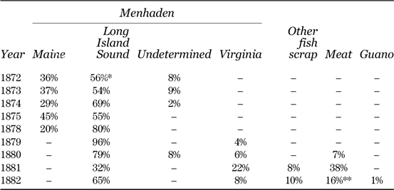Using menhaden as a fertilizer was initially an Indigenous practice in the northeastern United States, but it became increasingly industrialized in the middle of the nineteenth century as entrepreneurs sought to fulfill the growing national demand for fertilizers.Footnote 26 Large steam-powered vessels using purse seine nets caught the massive schools of fish that swarmed the shores of New York’s Long Island Sound and along the coast of Maine. These catches were subsequently brought to fish reduction factories, where they were boiled, pressed for their oil, and then dried to transform them into a nitrogen-rich substance called fish scrap that could be easily spread on fields.Footnote 27 Initially, most of this production was located on Long Island, but in the early 1870s the center of the industry shifted northward to Maine. By 1876, the state had become the largest menhaden processor in the country, producing roughly 70 percent of the nation’s total output of oil and scrap.Footnote 28