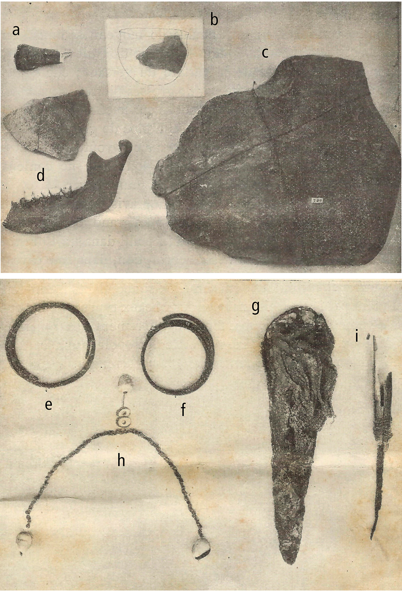 Figure 2. Grave goods published by Furgús (Reference Furgús1905). (a) Bone awl (?); (b) Sketch of the ceramic vessel; (c) Piece of ceramic vessel; (d) Skull fragment and part of the jaw; (e, f) Silver earrings (sic); (g) Bronze dagger or knife wrapped in a cloth; (h) Necklace (sic) of gold cones, three seashells and two small perforated ivory discs; (i) Metal awl with bone handle.