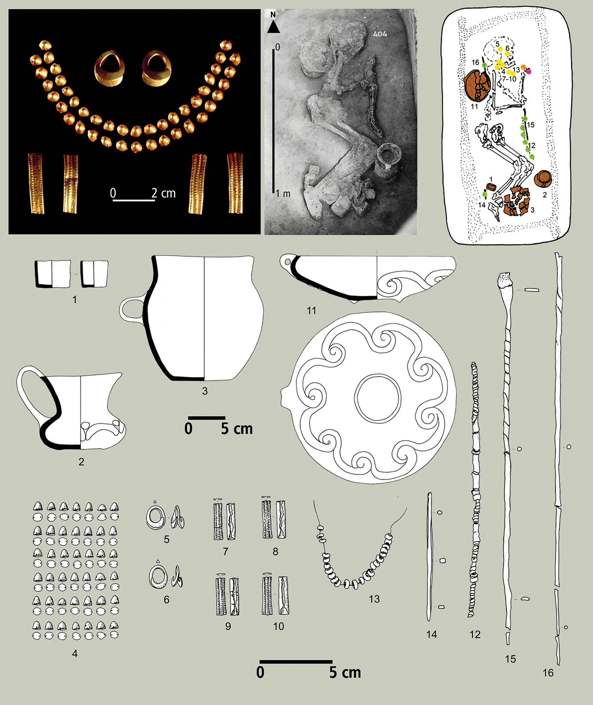 Figure 9. Gold objects from the grave goods of Nižná Mysl'a tomb 404 (photographs: Institute of Archaeology in Nitra; Slovak Academy of Sciences) and sketch of the burial with the distribution of the grave goods (adapted from Nováček Reference Nováček2017).