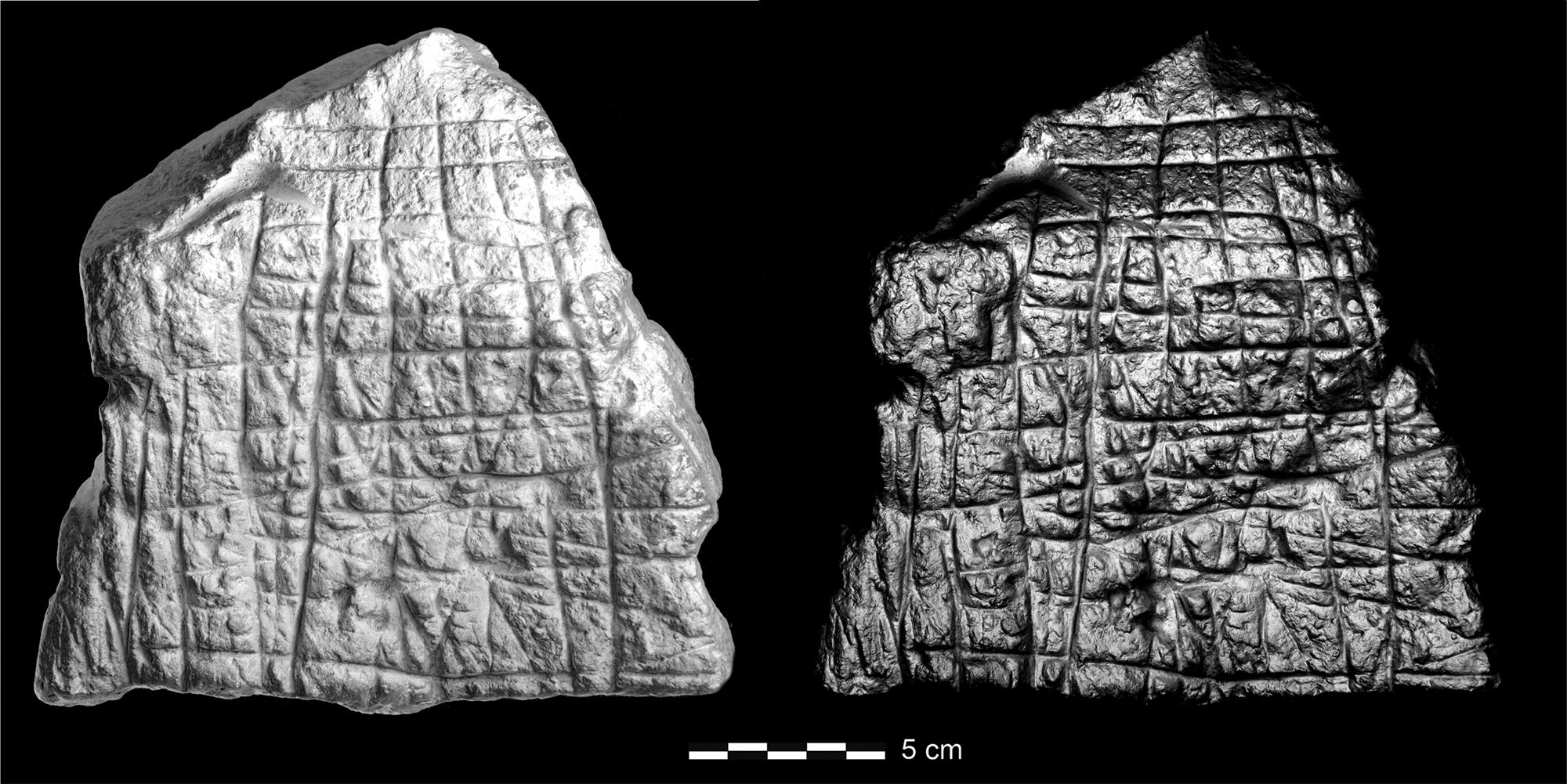 Figure 2. RTI images of the chequerboard incised chalk plaque from the third ditch of the Whitehawk enclosure (Brighton, Sussex). (Image: Marta Díaz-Guardamino. Courtesy of Royal Pavilion & Museums, Brighton & Hove.)