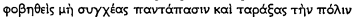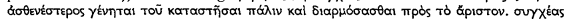 of the previous fragment, out for his own gain; all that we can tell from the introductory remark of Aristotle and Plutarch is that he would have made a worse job of reforming the constitution than Solon did. He may then be the immoderate reformer who, unlike Solon, would have thrown the state into chaos by his drastic measures, and so deprived it of its best element. Cf. Plutarch's paraphrase of part of the Phocus poem in Vit. Sol. 15, with its ending: ![]()