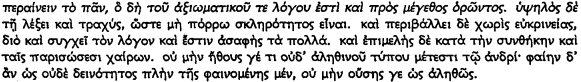 . A conversation follows between a son who has just acquired a city education and his father. The son keeps using new words, which are identified by the father each time as borrowed from Lysistratus, ‘the rhetores’, Alcibiades, and Thrasymachus. On the second occasion, in Hippocr. de offic. XVIII, B., 656 K., Galen cites two fragments from the first book of Antiphon's Truth (
