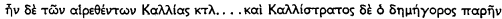 We read that Callias the son of Hipponicus, Autocles the son of Strombichides, Demostratus the son of Aristophon, Aristocles, Cephisodotus, Melanopus and Lycaethus, seven names in all, were sent as envoys, and further that the popular orator Callistratus was also present in Sparta. Included in the account are three speeches which at first sight are discordant and which Xenophon attributes to Callias, Autocles and Callistratus.