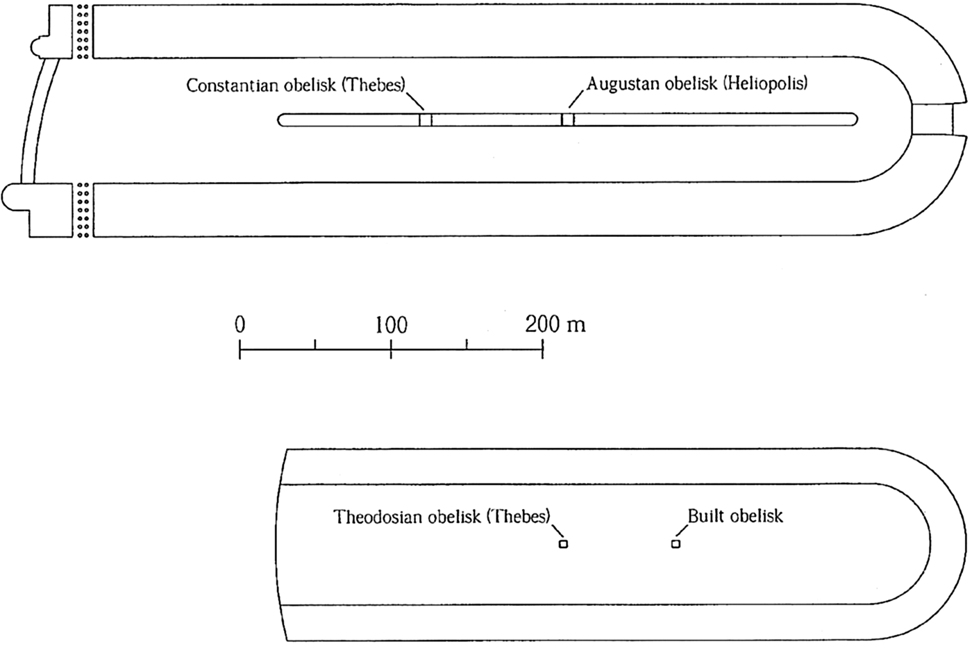 That the erection of this monument also gave the hippodrome not its first but its second obelisk is also highly significant, since the only other hippodrome in the Roman world to possess two obelisks was the Circus Maximus at Rome.Footnote 70 To raise a second obelisk in Constantinople was therefore to challenge the primacy of Rome, a powerful statement of the ambition that Theodosius had for the city. Nor is it possible that this correspondence was unintended, as Figure 4 shows: the obelisks in the Constantinopolitan hippodrome were placed exactly so as to mirror those at Rome.Footnote 71 The language of the inscription on the Theodosian Obelisk even seems to draw directly on that inscribed upon the base of Constantius’ obelisk in Rome, likewise erected to celebrate the defeat of a tyrant.Footnote 72 In adorning the hippodrome with this great monument, therefore, Theodosius proclaimed his ambition to be, like Constantine, the founder of Nova Roma, a gesture made all the sharper by the fact that Constantine himself had hoped to bring this very monument to Constantinople but had been frustrated in his attempt.