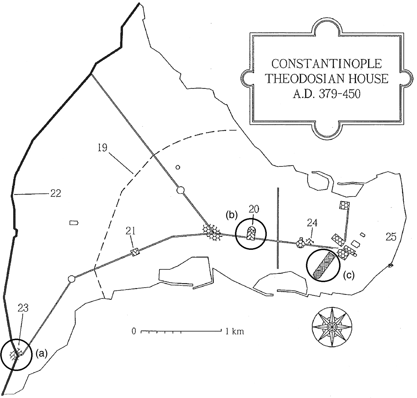 Figure 9. A typical route for an imperial entry into Constantinople from (a) the Golden Gate along the southern branch of the Mese to (b) the Forum of Theodosius and thence to (c) the hippodrome. Although imperial processions did not follow a set path through the city, this route was very common. Source: Bassett (Reference Bassett2004) 81, with additions by author. Image by Brian Madigan.
