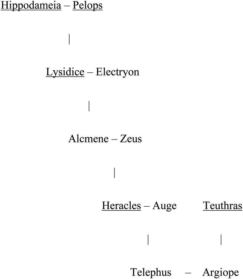More interesting than this clear generic signposting, however, is our poem's emphasis on the royal laudandus’ ancestry, developing the initial mention of Attalus’ κλῆρον … πατρώιον (‘paternal heritage’, v. 1). In a mere five lines, Nicander emphasises the Attalids’ alleged descent from Teuthras, Heracles, Lysidice, Pelops and Hippodameia, an impressive string of mythological forebears. The common, though unnamed, link between all these individuals is Telephus, the keystone of the Attalids’ fabricated family tree, both as the successor to Teuthras, king of Mysia,Footnote 22 and as the son of Auge and Heracles (the great-grandson of Pelops and Hippodameia, and the grandson, in some traditions, of Lysidice: Hes. Cat. fr. 193.19–20 M–W; see Fig. 1). The Attalids’ celebration of their Telephean roots is well known: we need only compare the interior frieze of the Great Altar, whose linear narrative recounts the birth and maturation of Telephus, as well as the Attalids’ Teuthrania offering at Delos, a statue group of local Pergamene heroes and ancestors which certainly featured ‘Teutras’ (= Teuthras) and may have included Telephus as well.Footnote 23 It is thus unsurprising to find that this mythical ancestry also receives detailed attention in Nicander's poem.Footnote 24