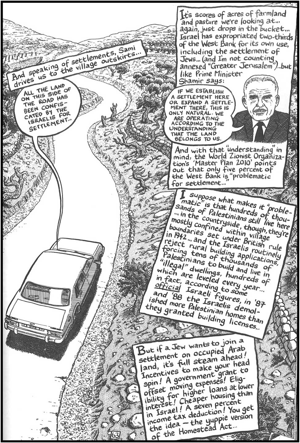 Sacco relies on the intersection between the visual and the textual to represent the occupation regime in this scene, however. In the vast swathes of land that he depicts—his taxi dwarfed by the rolling vista—there are no outward manifestations of military or violent control. Far from undermining the more self-evident expressions of violent occupation, however, this suggests the collective social absorption of “occupation” as a constant state. Although there are, as yet, no visible Israeli settlements, this land is still recognized as having been “confiscated” from the Palestinian people. In Sacco’s drawing, it is of further note that the caption boxes are imposed over the rendering of the land: a compilation of incentives for Israeli settlers (“A government grant to offset moving expenses!” see Figure 1) blocks reader perception of the rural vista, as does a photorealistic portrait of Israeli prime minister Yitzhak Shamir. The latter figure states that “If we establish a settlement here or expand a settlement there . . . we are operating according to the understanding that the land belongs to us.” That the lexical symbolism of this powerful Zionist “understanding” obstructs readers’ view of the occupied Arab land is a tangible reflection of the Israeli dominance. Thus, the form of comics enables Sacco thus to visualize the territorial claims of both sides of the conflict simultaneously.