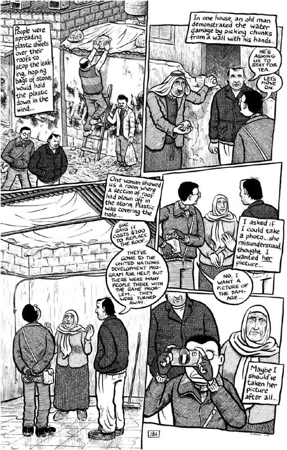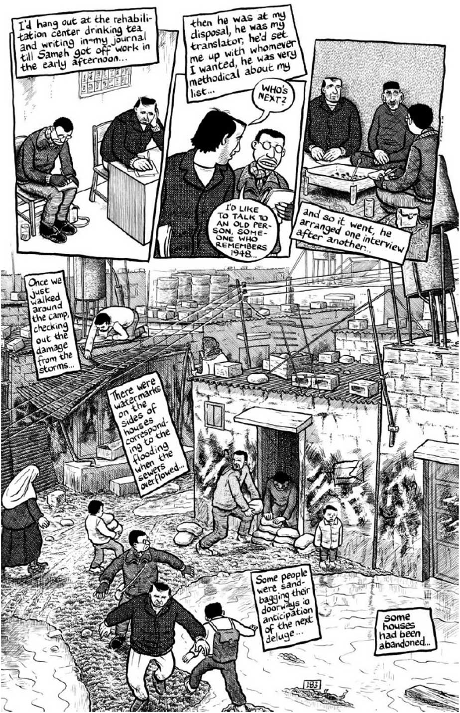 Joe Sacco’s Palestine narratives are therefore informed and shaped both by his personal observations and by the firsthand narratives related to him, both of which pay as much attention to the quotidian as they do to the kind of cataclysmic events that might more commonly be seen in global headlines. His work makes the continually violent occupation simultaneously into both art and journalism, weaving together these ostensibly divergent genres under the remit of comics to aid in collating Palestinian stories, and thus in “writing back” against the colonial impulses of occupation. Transcribed through the lens of his trademark self-deprecation and consciousness of his own fallibility as narrator and mediator, Sacco’s journalism masterfully interrogates complexities and nuances of lives under occupation. It is a representation both visual and literary of what he saw, delivering what he perceives to be the “essential truth” without assuming any kind of false objectivity.