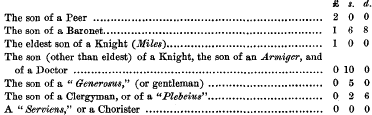 The scale of Matriculation Fees was simplified atva later date, Peers and their eldest Sons paying £8; the other sons of Peers, Baronets, and their eldest son, as well as Knights, paying £5; and all others, except Servitors and Bible Clerks, who paid 10s., a uniform fee of £2 8s. The present scale is £2 10s. for all, except the Servitor and Bible Clerk, who still pay 10s., and the “Privileged Person” (almost obsolete), who pays £1.