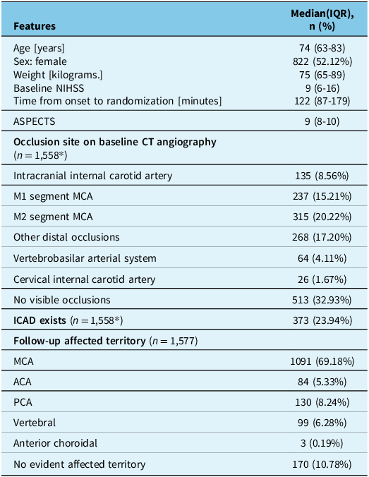 * 19 patients did not have a baseline CT angiography. ACA = Anterior Cerebral Artery; ASPECT = Alberta Stroke Program Early CT Score; CT = Computed Tomography; ICAD = Intracranial Atherosclerotic Disease; IQR = Interquartile Range; MCA = Middle Cerebral Artery; NIHSS = National Institutes of Health Stroke Scale; PCA = Posterior Cerebral Artery.