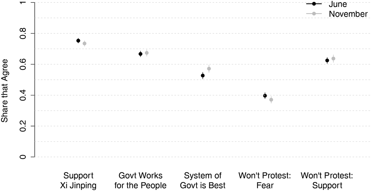 In the online Appendix, we probe whether these list experiment estimates vary according to demographic characteristics.Footnote 23 Across questions and survey waves, regime support varies consistently only across three characteristics: ethnicity, CCP membership and education, which are all associated with more support for the regime. First, ethnic Han support Xi Jinping about 20 percentage points more than minority respondents. In June, Han respondents were about 15 percentage points more likely to believe the government works for the people. In November, they were about 20 percentage points more likely to believe China's system of government is best and to refrain from protesting because of their support for government policies. This suggests the direct question result – Han citizens appear less supportive of the CCP – is driven by minorities’ fear of repression under direct questioning, consistent with the CCP's widespread ethnic repression.Footnote 24 Second, college-educated respondents are between 10 and 20 percentage points more supportive of the CCP than respondents who completed early middle school, although only three of five indicators are significant in the November survey. This may suggest the CCP's efforts to reshape educational curricula have succeeded.Footnote 25 Alternatively, this may reflect a job market that has long favoured college-educated Han.Footnote 26 Finally, CCP members are about 10 percentage points more supportive of the regime. This makes sense, since they elected to join the Party and benefit from its rents. Other demographic correlates are not consistently associated with regime support. We include a range of robustness checks in the online Appendix.