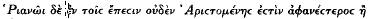 7 That is the common view, and probably correct, though challenged by Kokolakis (n. 3, above), pp. 28ff., to whom I assented in Gnomon 41 (1969), 699. ‘Forgetting that his parents are mortal’ (Rhianus line 11) might cover rulers who deified their parents (e.g. the Ptolemies) as well as those (e.g. Alexander the Great, Seleucus I) who claimed that their real father was not a mortal but an Olympian god. Aspiring to marry a goddess (Rhianus line 14), while characteristic of blasphemers in general, was also ascribed to rulers of the fourth century B.C. and later, e.g. the Thracian Cotys, who according to Theopompus (F.Gr.Hist. 115 F 31) ![]()