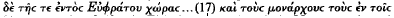 , that would tell against Mynors′ remark in his Georgics commentary ad loc., ‘It would be a mistake to see an allusion here to Jupiter the thunder-god.’ Some have also wished to connect Virgil′ mention of the Euphrates with Callimachus′ ‘Assyrian River’ (hymn 2.108). I am not wholly convinced that the link is significant, despite the fact that in both passages (and in Georgics 1.509) the river is placed six lines before the end of the poem or book. Suggestion of progress to, and potentially beyond, the Euphrates shows the intoxicating influence of Alexander the Great, which is as apparent in Ptolemy III Euergetes′ lost inscription from Adulis (OGIS 54, transcribed by Cosmas Indicopleustes in the sixth century), lines 13ff. ![]()