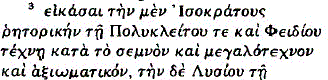 Phidias’ absence from the survey of sculptors in Cic. Brut. 70 is curious, explanation in terms of differing histories of sculpture only partly convincing. I suggest that Cicero has valid literary motives and is wittily undermining the Atticist position by adaptation of what was a rhetorical topos, the parallel development of Greek prose and sculpture from archaic spareness to classical expertise and dignity: see Dem. Eloc. 14, D. H. Isoc. 3, p.59 U-R; more elaborate but partly deriving from Cicero and less homogeneous is Qu. 12.10.7–9. Cicero assumes the reader's knowledge of the commonplace, pointedly ignores the quality of grandeur and dignity, and develops a theory of technical progress on the basis of veritas and grace to attack the Atticists from their own preferences. The resulting model serves to demote Lysias, imitated by the Atticists but merely the counterpart of Calamis, strigosior (64) like archaic sculptures (cf. Dem. loc. cit. ) and superseded by later progress. The analogy thus obliquely repeats the brief but charged parenthesis in 66 that Demosthenes superseded Lysias.