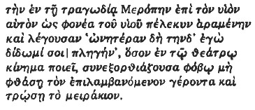 page 84 note 1 Stinton, pp.253–54, working from Glanville, p.55 nn.6, 7, cl. Rhet. 1385b13, 1386a34, 1382a21 (below, p.86 n.2). The point was already made by Vahlen, pp.53 ff., and accepted by Else, p.451. That it is relevant to Poetics 14 is suggested by 14, 53b 18 ![]()