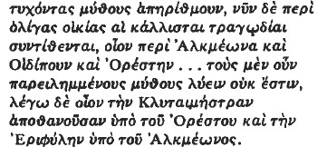 page 82 note 4 The fact that the mode recommended as best in ch. 14 is not mentioned at all in ch. 13 might seem to suggest that the final preference of ch. 14 is an afterthought, rather than a properly considered change of mind. But it is hardly likely that when writing ch. 13 Aristotle should have forgotten of the existence of plays like the Ion, Cresphontes, and Ipbigeneia in Tauris, and the emphatic phraseology of 13, 53a14–15 ![]()