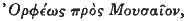 Only the first hymn lacks a heading. It is preceded in the manuscripts by a poem in which Orpheus addresses Musaeus and teaches him a prayer to a multitude of gods