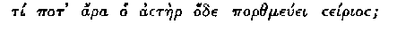 page 352 note 2 Bremi; so Kirchhoff, England, el al. Their motive has usually been to make άcτίρcείιοc ctipioc refer to an unnamed planet or star, to obviate the ‘astronomical error’ in ⋯γγύc. Despite Theon's similar view in antiquity (n. 4 below), there can be no question that Cείροc is here the Dogstar, in the light of the parallels given above.