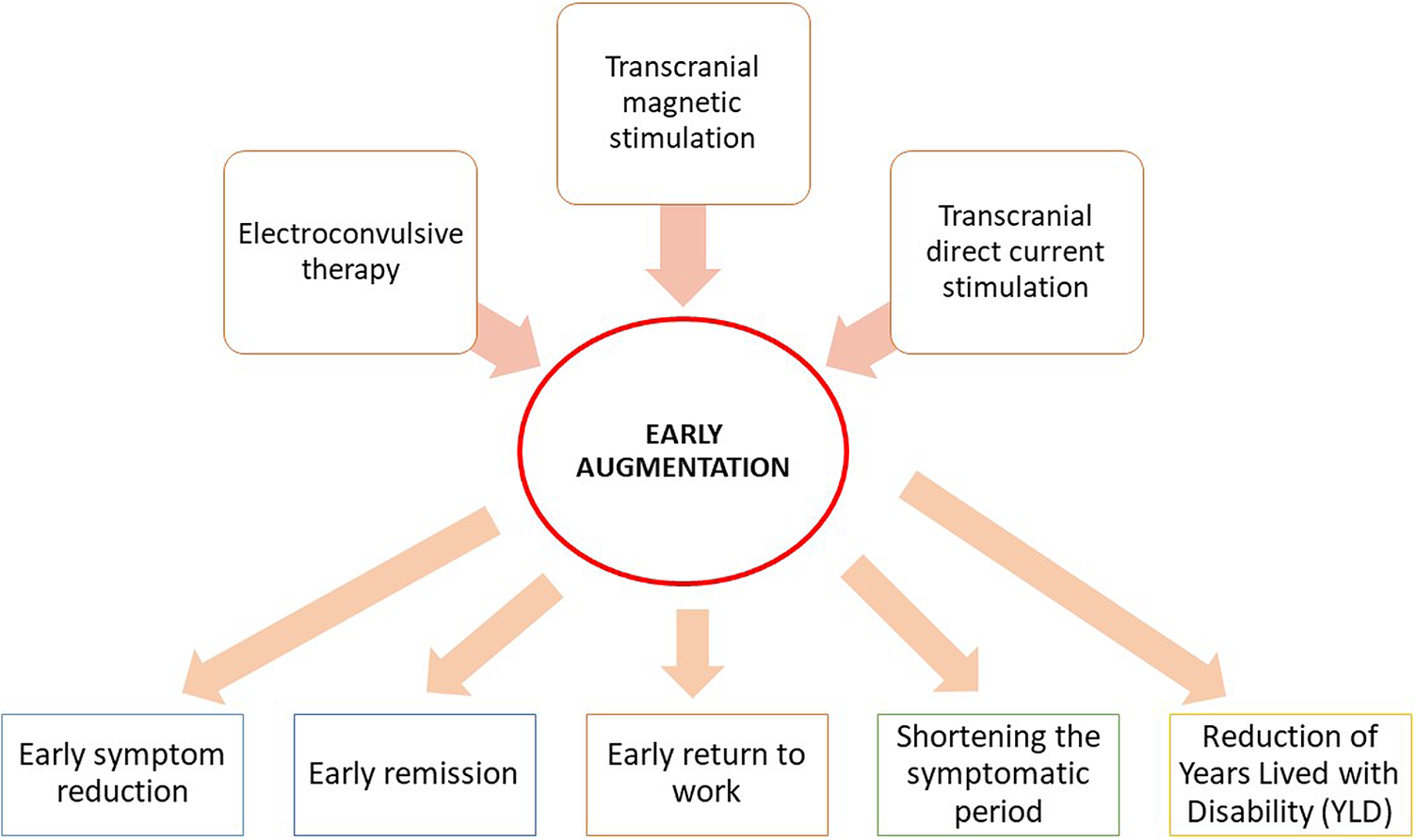 In a study, patients with major depressive disorder with inadequate response to antidepressants received early augmentation with antipsychotic medications. It was found that the patients receiving early augmentation had reduced healthcare expenditure.Reference Yermilov, Greene and Chang 6 Augmenting pharmacotherapy with cognitive behavior therapy in obsessive–compulsive disorder is found to be more effective in reducing the symptoms severe cases of obsessive–compulsive disorder.Reference Guzick, Cooke and Gage 7 , Reference Skapinakis, Caldwell and Hollingworth 8 In most conditions, psychotherapy (eg, cognitive behavior therapy) is introduced early in the course of treatment as an addition to the pharmacotherapy. Here, the argument is: If early augmentation of pharmacotherapy with psychotherapy gives better outcomes in various psychiatric disorders, then why not the novel neuromodulation techniques should be used as an early augmentation to treat psychiatric disorders. Early augmentation with repetitive transcranial magnetic stimulation (rTMS) has been tried in a patient after 4 weeks of initiation of antidepressant treatment, and there was a substantial reduction of depressive symptoms with this strategy.Reference Singh, Singh and Kar 9