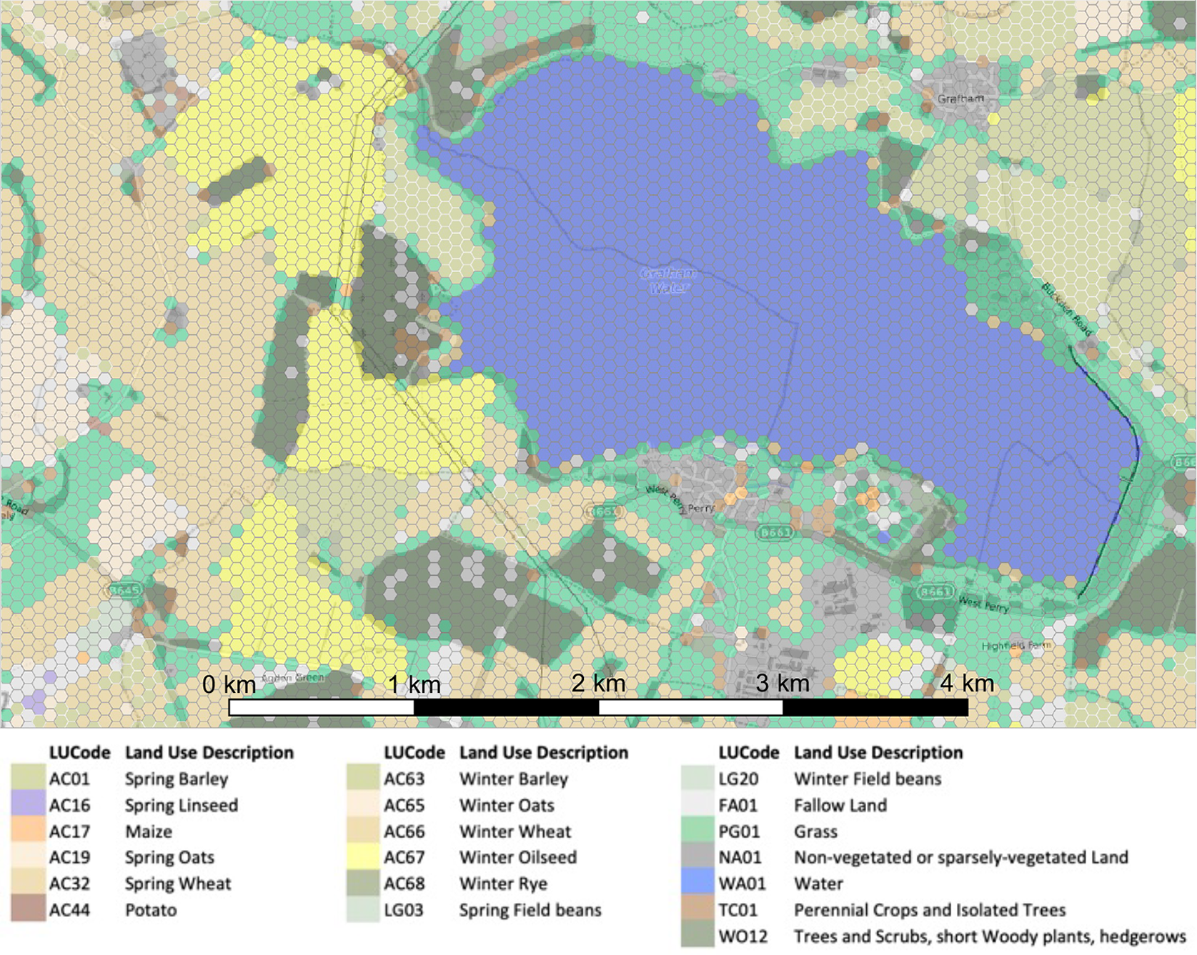 The CROME data offers several advantages. The data are available under an open government license (The National Archives, 2021) and are published annually in a machine-readable format. It is further assumed that the data are likely to continue to be available in future years. However, there are also a few issues. Firstly, there are instances in which land use is misclassified when a hexagonal cell overlaps two different land use types. Secondly, although CROME is produced by the RPA, the LUCodes that appear in the CROME data (Rural Payments Agency, 2019a) and the LUCodes published by the Rural Payments Agency (2019b) exhibit some minor differences. For example, CROME defines TC01 as “perennial crops and isolated trees” (Rural Payments Agency, 2019a), whereas the RPA defines TC01 as “permanent crops other than nursery crops and short rotation coppice” (Rural Payments Agency, 2019b). Thirdly, it was found that there were no instances of LUCode SR01. This corresponds to “short rotation coppice” which is an energy crop. This is surprising because short rotation coppice certainly exists, and the reason for the absence of SR01 remains unexplained. Finally, the CROME data only cover England, rather than the whole of the UK.