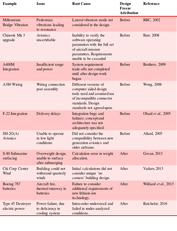 An empirical perspective was applied to quantify and study why requirements are missed in the development of complex systems. While the results shown in Table 1 remain anecdotal evidence from publicized cases, it also creates a basis of hypotheses for root causes. We seek to understand if missed requirements occur more often or not in the early phase of design, as separated before and after concept freeze.