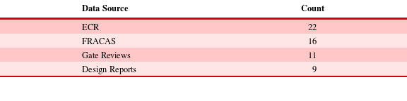 For very late detection of missed requirements, the FRACAS contained the relevant information. For missed requirements detected after design freeze but before service, the ECR system contains the relevant information. For missed or evolving requirements before design freeze, gate review documentation provided information on the state of the requirements at each design review. Design reports were also used at the company for status of requirements up to design freeze.