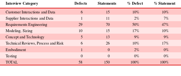 To relate the interview responses to the previous activity quantification, the 58 design defects (Figure 7) were also grouped into eight categories. This is shown in the third column of Table 8. The relative percentage of design defects and interview statements is shown in Table 8, and a Chi squared test indicates the two agree with p-value
