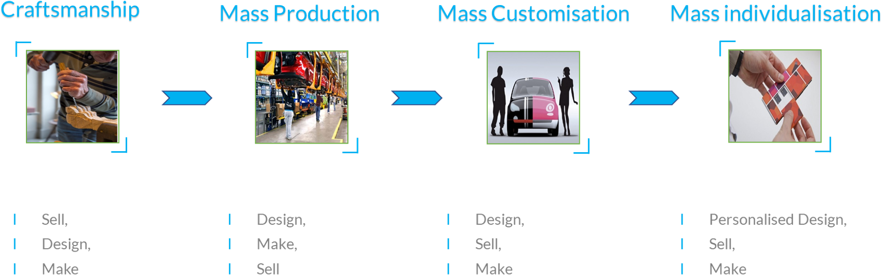 Over time, product design has changed considerably, from individually crafted designs to product design for mass production, followed by the product design for mass customisation. These developments have been predominantly triggered either by market conditions or by the consumers’ desire for the product offering.