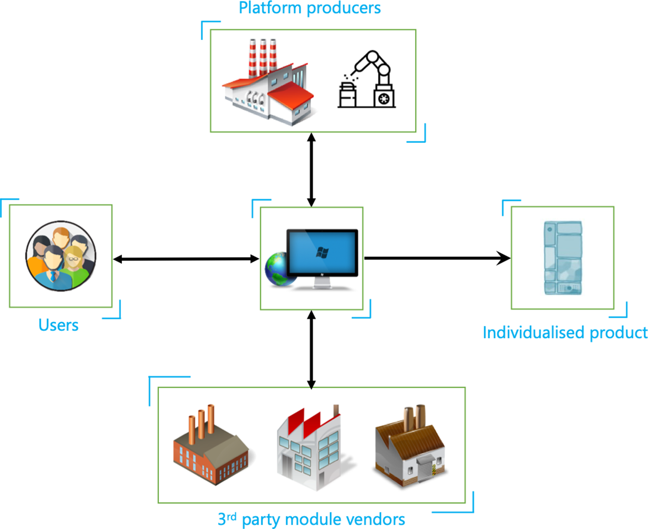 Large manufacturers have the potential to offer a product platform with interfaces for a provision to add different modules. The large manufacturers would also provide few specific add-on modules for certain specific functionalities of the product. It is envisaged that these platform producers would also play an important role in the assembly of module options on the platform and after service of these products. The third-party module vendors will invent and manufacture module options for the end-users to opt for and to integrate into the product platform. Every actor will have the opportunity to incorporate smart and innovative capabilities in module options. Specific add-on modules with specific nature and functionality will be provided when the end-users buy the product for the first time. Unknown add-on modules would be provided to replace or upgrade the product as per the user’s requirements which were not thought of at the time of purchase. This kind of ecosystem shifts the competition basis from discrete end products to module options.