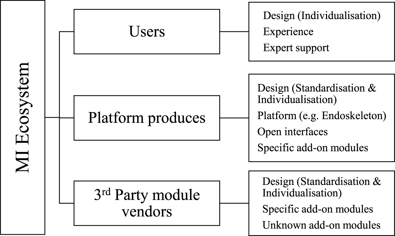 (ii) Ecosystem: MI ecosystem consists of three main actors: end-user, platform producer and various module options providing companies (such as third-party vendors and independent module developers). All the actors can be mapped with a multilevel and cross-connected ecosystem framework to disentangle and manage the relationship among them. This framework would include the expectations and goals of participating stakeholders/actors. Strategies developed for value co-creation in a multistakeholders atmosphere for a firm (Nudurupati et al. Reference Nudurupati, Bhattacharya, Lascelles and Caton2015) can be used as a basis for the ecosystem.