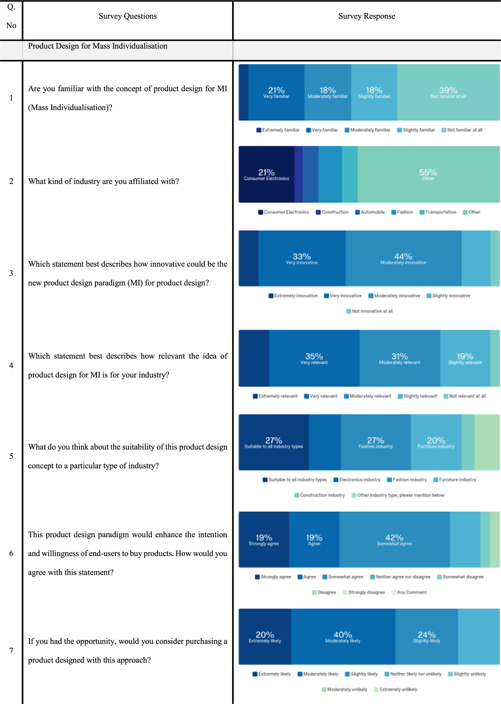 The first five questions aimed at obtaining insights on the current product design approaches and the significance of the innovative product design approach of MI. It can be seen in the responses to Question 1 (Q.1) that the majority of the respondents are unfamiliar with MI. It can be explained from the fact that product design for MI is a relatively new product design approach that requires further research and development in different aspects of the approach. This work provides an initial framework in that direction. Q.2 responses provide an indication that the majority of the participants are from consumer electronics companies. This is consistent with the assertions made earlier that consumer electronics goods would be the starting point for the market implementation of the product design for MI. Responses to Q.3 are encouraging and consistent with the objective of this article that product design for MI would lead to more innovative end products tailored to the exact needs of the end-users. Q.4 was designed to understand the applicability of this approach. Responses to this question provide mixed agreement. It can be explained from the fact that some market segments, probably consumer electronics companies as demonstrated in the Q.2 responses, would regard product design for MI as a more beneficial product design approach. Q.5 was designed to understand the application of MI to types of industry. Twenty-seven percent of responses agreed with the suitability of MI with all types of industries, but interestingly equal responses showed the Consumer Electronics, the Fashion industry and the Furniture industry as leading beneficiaries. This could be inspired by the existing application of product customisation in these areas. From this survey response, this can also be understood that some users/industries might prefer standardised products rather than individualised ones.