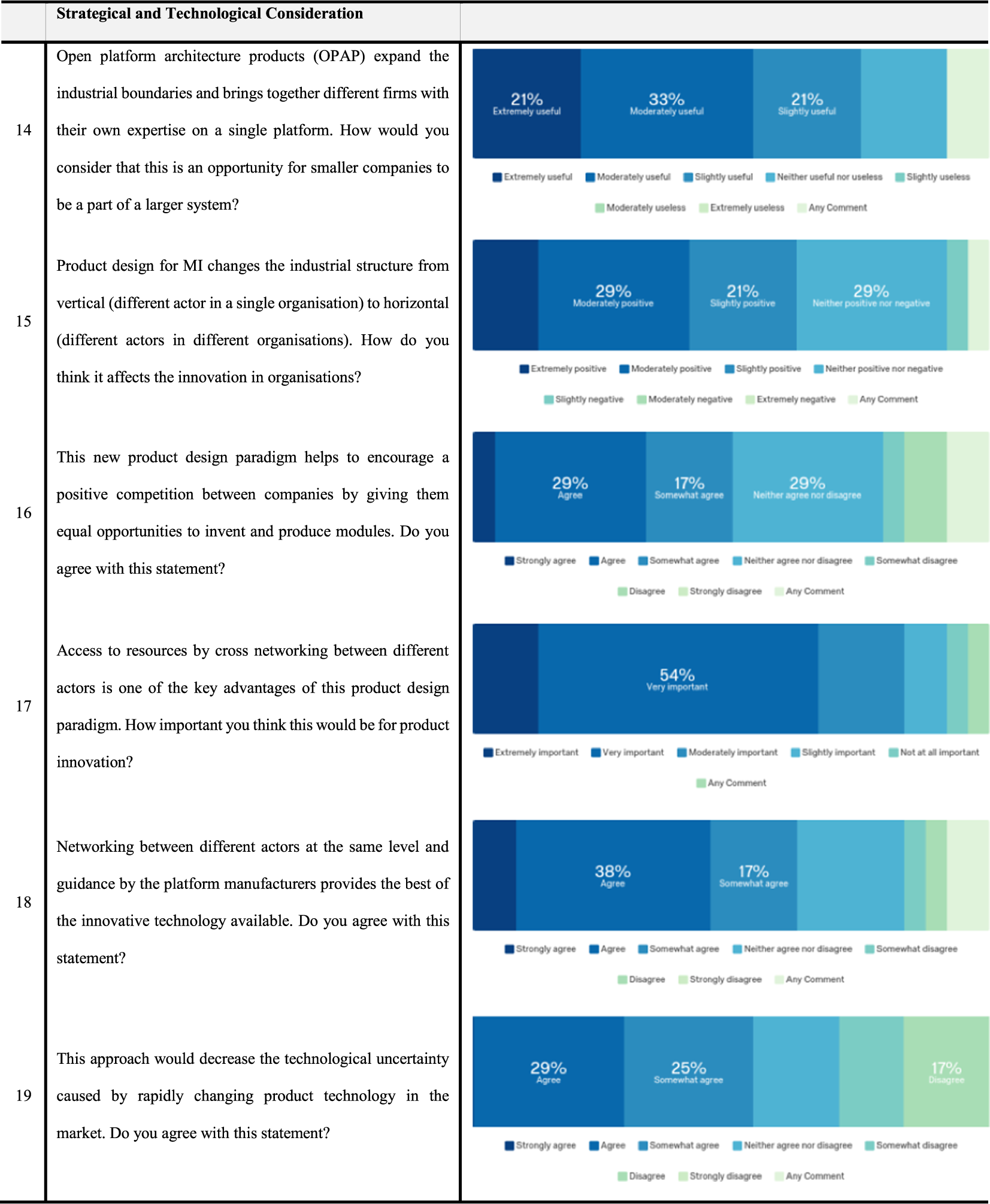 Thirty-two percent of the responses to Q.13 are in agreement with the notion that the end-users will be motivated enough and will contribute towards product innovation. It is evident from the fact that they will be able to select and even produce module options. However, 28% of responses are only slightly agreed with this question. It could be inspired by the fact that end users may not possess enough skills set and understanding, including acquiring appropriate requirements and generating suitable module options.
