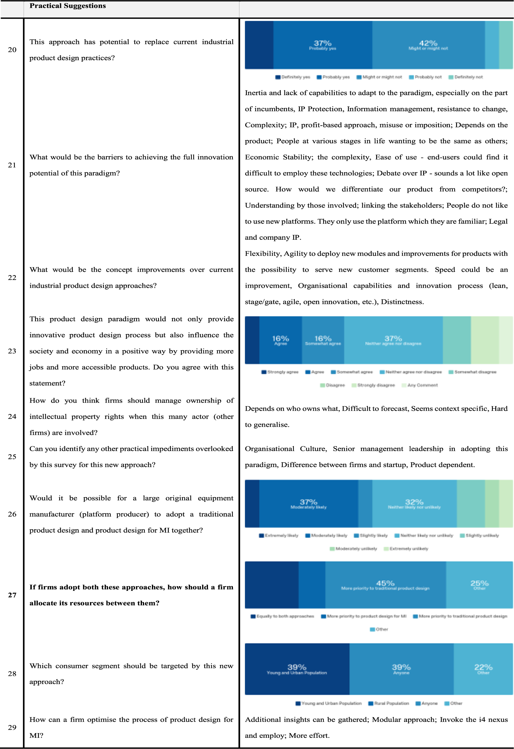 Q.20–Q.29 were designed to obtain some practical insights and suggestions to ensure that we did not miss them in earlier questions. To gain insights on the practical benefits of product design for MI in comparison with existing product design and customisation approaches, a descriptive question, Q.22 was included. Responses to this question provided insights into many frontiers. Responses show that this new approach will give greater flexibility, speed, and distinctness, the potential of serving to a new customer segment and product innovation in terms of the product offering. These responses were quite motivational as they provided many positive improvements which product design for MI might lead in traditional product design. Q.21 provided potential barriers to achieving the full innovation capabilities of this paradigm, including complexity, dependence and differentiation. Responses to Q.23 indicate that above 65% of participants are in agreement with the notion that product design for MI will create new jobs along with more accessible products. Q.24 was designed to gain insights on intellectual property rights (IPR) in this product design approach. Responses to this question listed different perspective to handle IPR; it is challenging to forecast, it will depend upon who owns what. Responses to this question provide a basis for further investigation regarding IPR in MI.