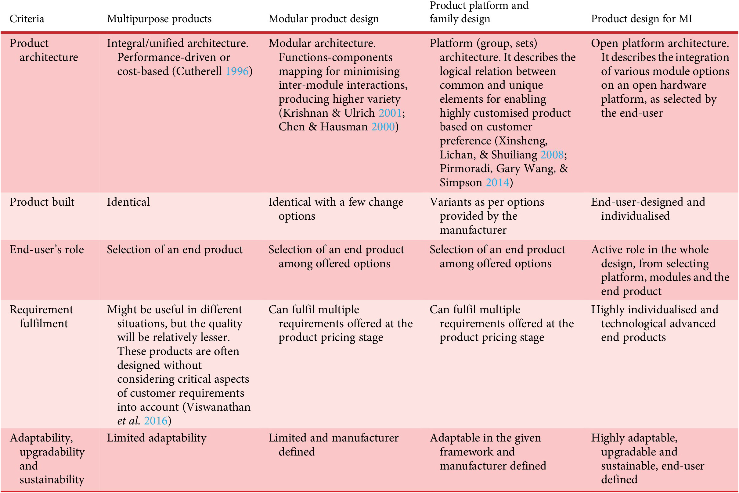 As mentioned in the earlier section, MI is a development on the existing user-centric customisation and personalisation approaches for product design including multipurpose products, product modularization and product family design. Table 1 shows how MI is different from existing product customisation and personalisation approaches.