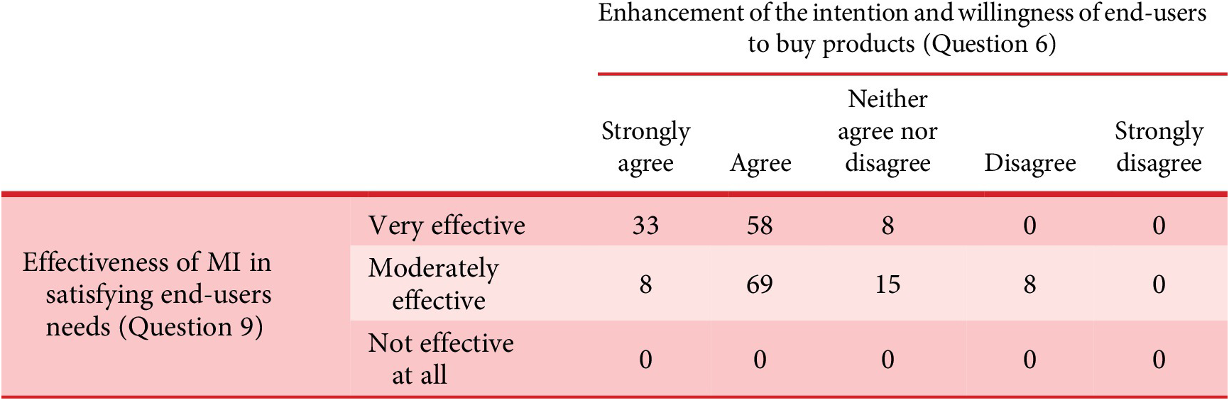 Table 2 illustrates a comparison of responses provided for Q.6 and Q.9. For ease of analysis of responses of Q.6, somewhat agree and agree responses are bundled together under agree column, so thus the somewhat disagree and disagree one under disagree column. Similarly, for the responses to Q.9, very effective and extremely effective responses are bundled together under the column of very effective response, so thus slightly effective and moderately effective under moderately effective column. It is interesting to note that the majority of responses that agree with the fact that MI would be moderately effective to very effective, also agree with the notion that it would increase the intention and willingness of the end-user to buy end products designed with this approach. This co-relation emphasises that customers would be much happier to purchase a product if it is more individualised to satisfy individual needs. This proves the potential of MI in addressing the market to one phenomenon.