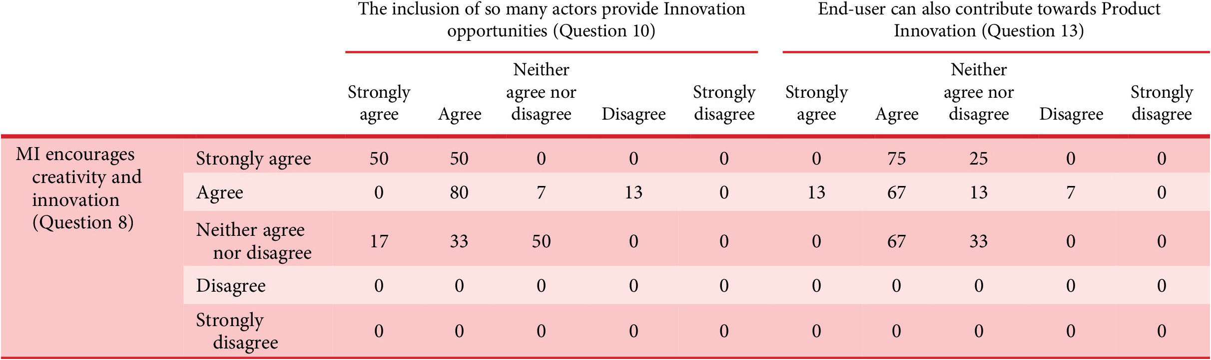 Table 3 provides a very useful comparison of Q.8 with Q.10 and Q.13. For ease of analysis of responses, somewhat agree and agree responses are bundled together under agree column, so thus the somewhat disagree and disagree one under disagree column. Q.8 explores the possible encouragement to creativity and innovation in the product design process provided by MI, and Q.10 and Q.13 explore the reason behind that encouragement. It is evident from this table that the percentage of responses that are in agreement side of the idea that MI motivates creativity and innovation, also agree with the fact that this encouragement to creativity and innovation might be because so many active actors are included in the product design process and also because of end-user’s direct contribution.