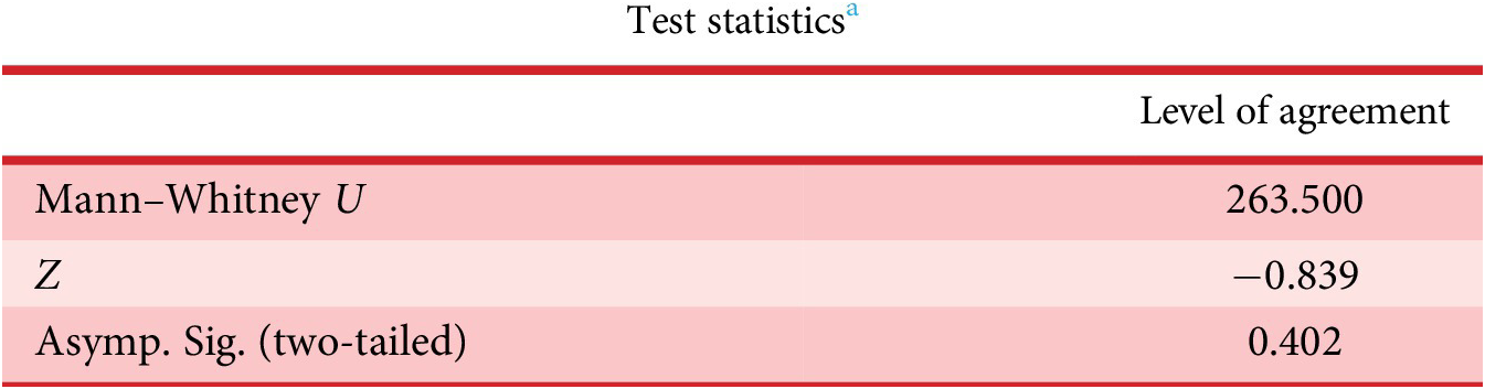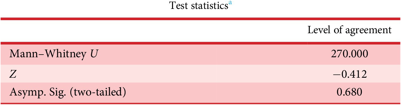Responses to Q.8, Q.10 and Q.13 are further analysed to see any statistical difference between these responses. IBM SPSS is used to carry out this statistical analysis. A nonparametric test, known as the Mann–Whitney U test is selected for this statistical analysis. It is used to compare differences between two independent groups when the dependent variable is ordinal. ‘No difference between responses from these two groups/questions’ is used as the null hypothesis.