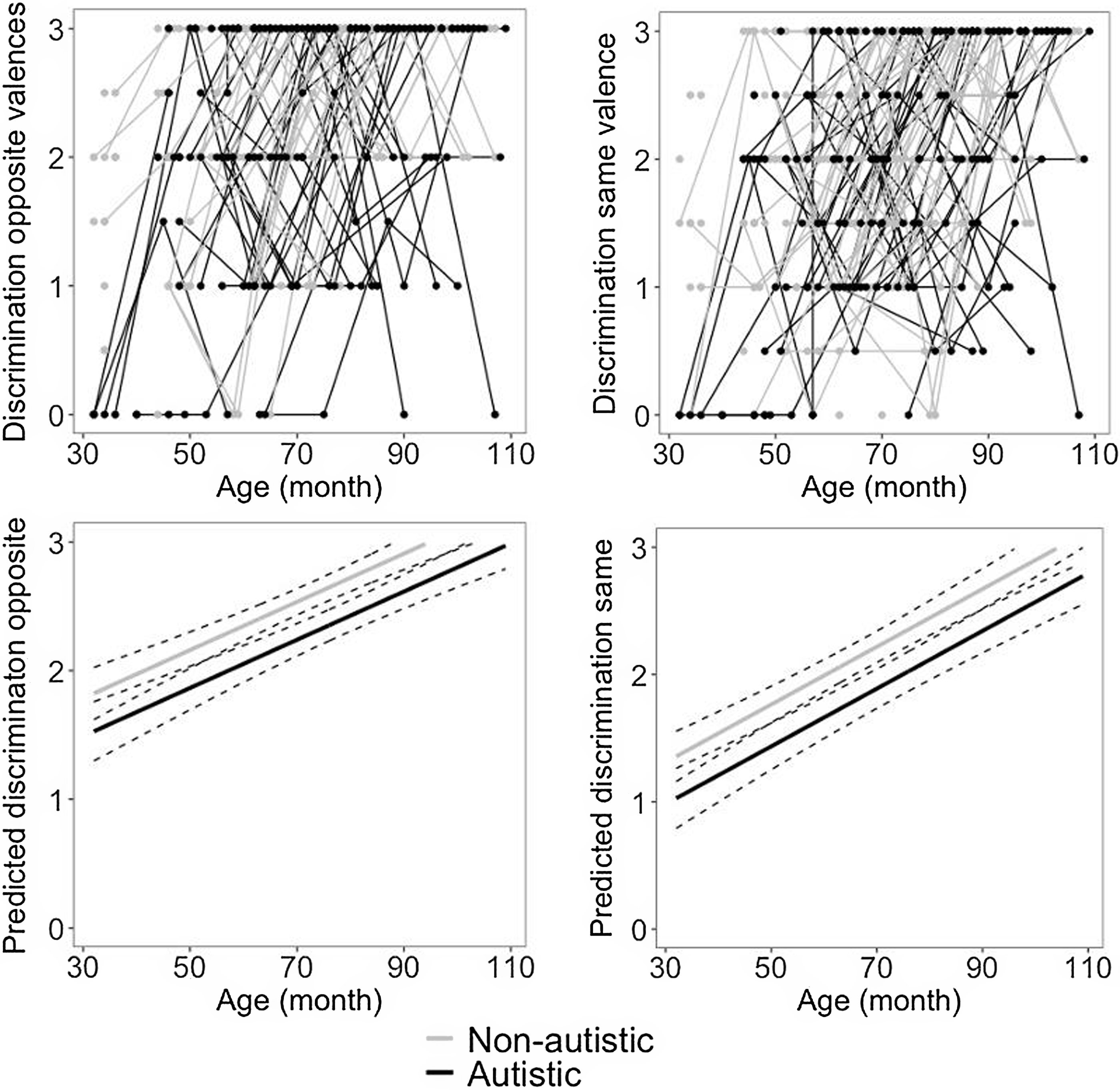 Table 4 provides the estimates of the best-fitting models for emotion attribution (see also Supplementary Table 9). Figure 3 depicts the developmental trajectories of emotion attribution in autistic and non-autistic children.