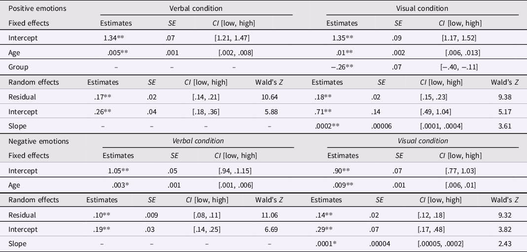 The best fitting model for attributing positive emotions in the verbal condition was only with the fixed effect of linear age: t(370,74) = 3.55, p < .001, showing that autistic children did not differ from non-autistic children in the level nor in the developmental trajectory and this ability improved over time in all children. The best fitting model for attributing positive emotions in the visual condition was with the fixed effect of linear age: t(124.04) = 5.41, p < .001, and group: t(132.50) = −3.58, p < .001, showing that this ability increased in both groups, and autistic children scored overall lower in the visual condition than non-autistic children. Besides, there was a random effect of linear age: p < .001, indicating that there was a great individual variability in the age slopes.