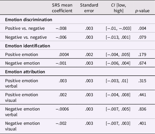 Adding the SRS mean as a predictor to the best age models improved model fits for all predicting models (see Supplementary Table 10 for information on model fits and model comparisons). However, there was only one significant effect of the SRS mean, that is, a higher mean level of SRS contributed to predicting a lower level of emotion discrimination between positive and negative emotions for autistic children: b = −.008, CI [−.01, −.003], t(61.47) = −2.99, p = .004. For the development of other emotion-recognition abilities, no significant effect of the SRS mean was found. See Table 5 for the coefficients of the SRS mean in the predicting models.