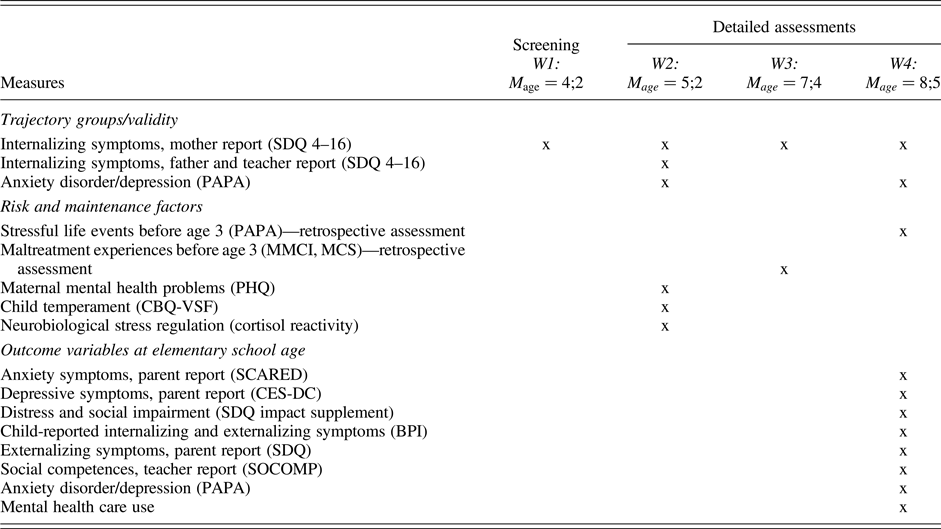 Except for the baseline screening, all assessments took place in the research laboratories of the Department of Child and Adolescent Psychiatry, Psychotherapy, and Psychosomatics, University of Leipzig. Mothers completed several measures regarding their child, their own mental health, and the family situation. One of the parents, mostly mothers, also took part in clinical interviews regarding their child, once when the child was of preschool age (Wave 2) and once when the child was of school age (Wave 4). Meanwhile, the children were interviewed separately. Table 2 gives an overview of the waves of data collection and the measures assessed.