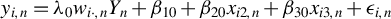 $$ \begin{align} y_{i,n}=\lambda w_{i\cdot,n}Y_{n}+x_{i,n}'\beta+\epsilon_{i,n}\equiv\lambda\sum_{j=1}^{n}w_{ij,n}y_{j,n}+x_{i,n}'\beta+\epsilon_{i,n}, \end{align} $$