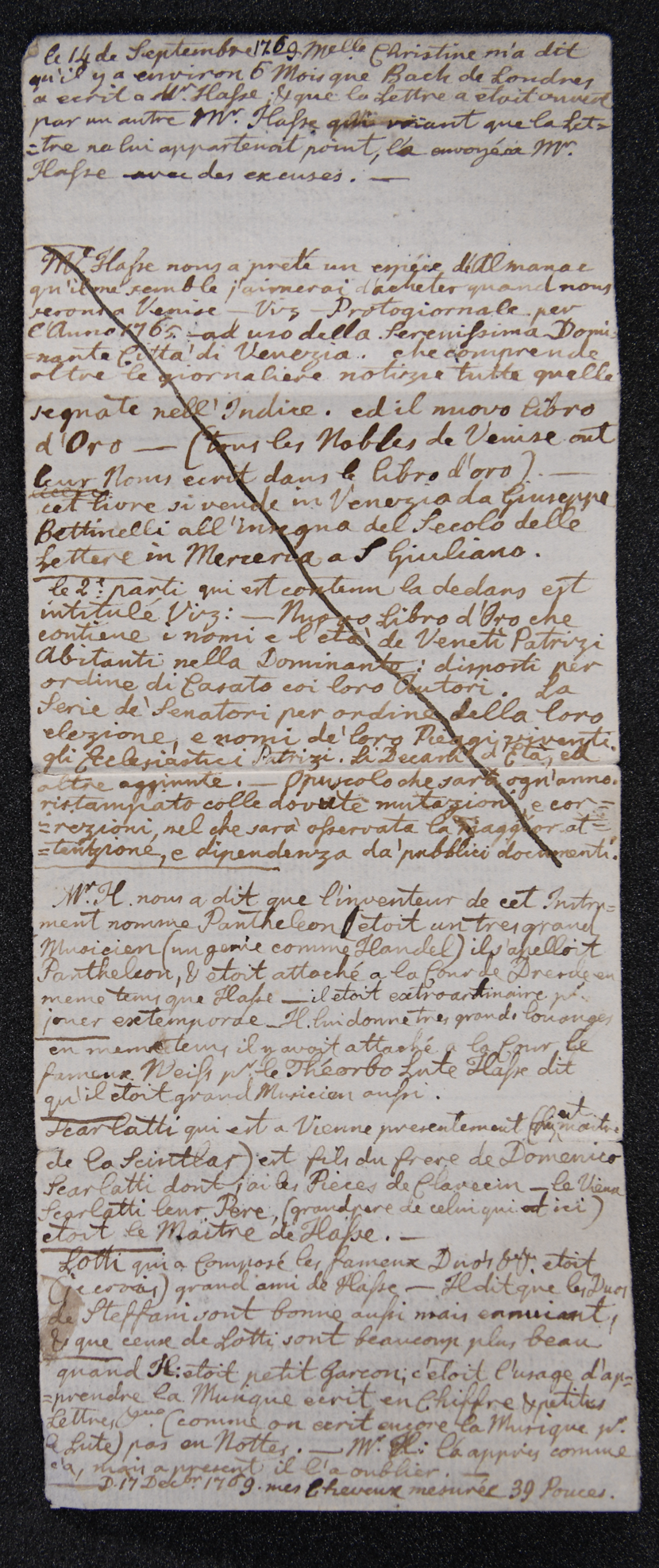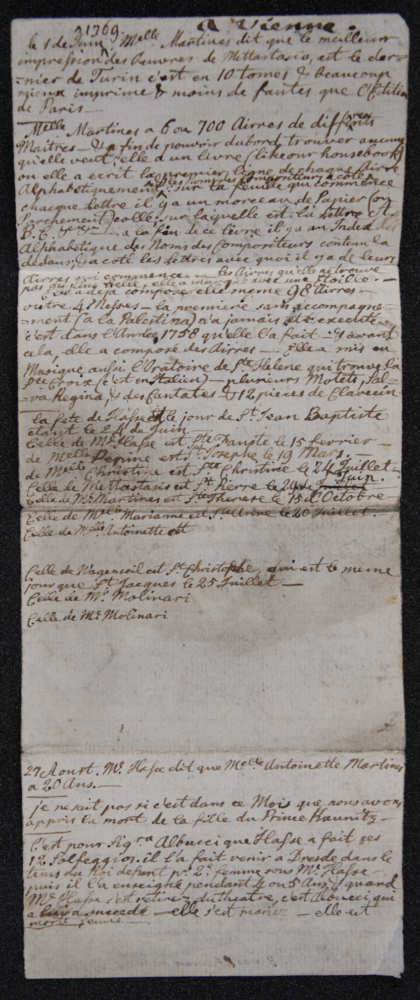 ‘A page from a diary in French and Italian (author unknown), dated 1769 “in Vienna”, concerning various musical acquaintances, as well as various musical works and books’