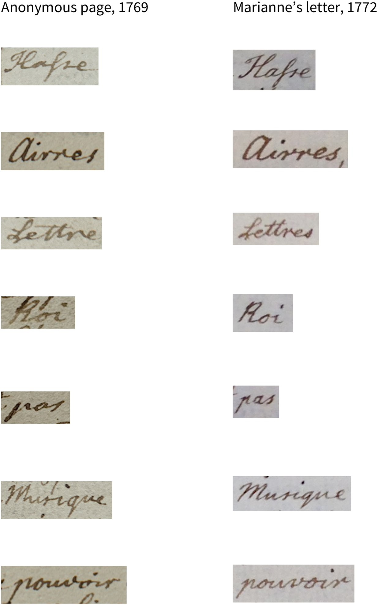Marianne's respect for the Racketts is evident in the look of the private letter, which shows signs of considerable effort in achieving a neat layout, starkly contrasting with the hurried, private aide-mémoire format of the item under discussion. In spite of this, there is a convincing match between many words that feature in both documents. In Figure 2, I have presented the words Hasse, Airre, Lettre, Roi, pas, musique and pouvoir as they appear in each document. The shaping of these words is strikingly consistent. The formation of the upper-case consonants M, P and T as well as the shape of double consonants ss, tt and rr provide a convincing match; so too does the open loop of the lower-case p of pas and pouvoir and the sharp stroke that joins the q to the u in Musique.