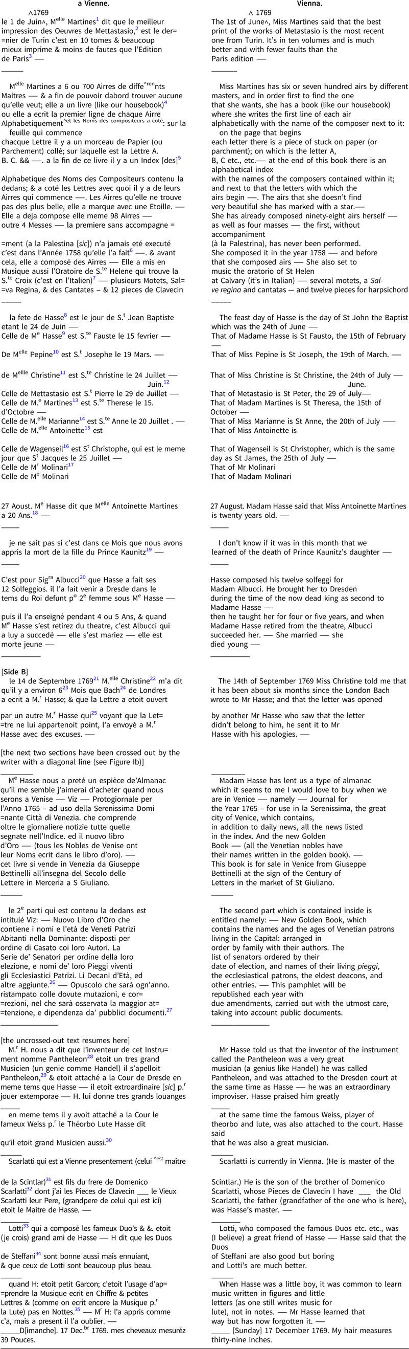 The document examined here provides new information about musical life and everyday happenings across six months spent in Vienna in 1769. Bringing to light the musical opinions and prejudices of Johann Adolf Hasse and offering insights into his teaching methods, it also reveals glimpses of the professional guidance and mentorship provided by the soprano Faustina Bordoni towards a young virtuosa. The document further provides an image of the working practices of Marianna Martines and uncovers new data relating to her output and the chronology of her compositions. In addition, it appears to show Martines's support for and encouragement towards another young female musician. The document presents a series of events and encounters that correspond strikingly with known happenings in the lives of the Davies sisters, who were present in Vienna at this time, lodging with the Hasse family. During the period of the page's creation, Marianne and Cecilia Davies were engaged to perform for an imperial wedding and gave frequent performances before the Empress herself, yet their names are not mentioned. The identification of Marianne Davies as author of the document can be supported further by similarities in handwriting styles between it and Marianne's private letter, written just over two years later.