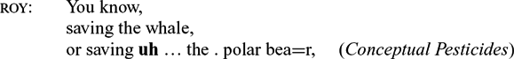 In (1)–(3) the function of uh and um is that of ironic euphemism, ‘putting it delicately’, and in (4), um is used for disagreement in a vocative sentence. Polite avoidance of unpleasant realities like graying hair, castration, sleeping at the theatre and disagreement is a common factor in all of these examples. This is not an exclusively American phenomenon; British magazines and newspapers also provide examples of er and erm in similar uses, as shown by (5) from sports pages and (6) from a film review. Again, we have ironic euphemism here: the Liverpool soccer players mentioned in The Independent have clearly not gone on to finals or semi-finals, and the Guardian headline is beating around the bush on a sensitive topic.