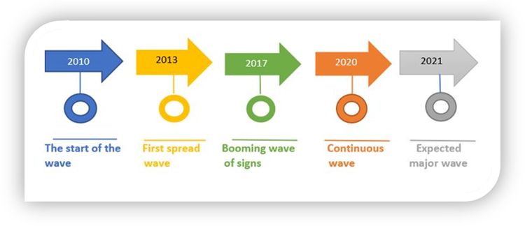 Based on our observation, memories, the previous table, the social media official accounts of these businesses and their earliest publications, and the interviews conducted with three owners of businesses mentioned in Table 1, the following account can be presented. Algeria has undergone a booming wave of English-language signs starting in 2010 with larger spread in 2013 to boom in 2017, and to continue to 2020 and it is expected to result in a major wave in 2021. In 2010, the wave was not as significant as in 2013 since there were few English signs in 2010. However, by 2013, more businesses followed the wave. In 2017, on the other hand, bottom-up signs were easily and clearly observed in the Algerian linguistic landscape, which is why it is described as the year of the booming wave. In the following years, English appeared to become a trend among new business owners who continued to use English in their signs. Therefore, the timeline is expected to progress according to the trending wave that occurred in previous years. Figure 5 interprets these findings in a timeline that illustrates the start of the wave of bottom-up linguistic landscape signs in Algeria.