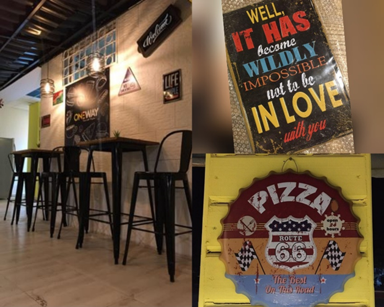 The interior of a restaurant in Figure 6 shows the use of different shapes with random English expressions, such as ‘it has become wildly impossible to be in love with you’, ‘welcome’, and ‘pizza, the best on the road’.
