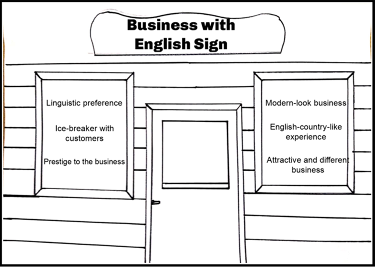 The following sketch (Figure 8) summarizes the main reasons for the shop and restaurant owners to use English in their signs. The reasons include ideas such as linguistic preference, ice-breaker with customers, adding prestige to the business, modern-looking business, English-country-like experience, and being an attractive and different business. The sketch was drawn by a professional in interior design to illustrate an imaginary business front (for the purposes of the current study), while the content is the summary of the authors.